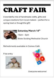 Join us at Stoke Golding Methodist Church Craft Fair, between 10am – 3pm for a fun, hands-on creative activity suitable for all ages! Visit our stall and design your very own personalised mug for £10 to take home the same day – perfect as a unique gift or a special treat for yourself.